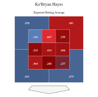 Ke'Bryan's slash line this year was .376/.442/.682/1.124. He excels at hitting the ball in practically every zone except high and inside. He loves to extend his arms and uses his above average speed to leg out base hits. The drop off doesn't seem to steep from BA to expected BA. Typically, a hot hitter will see a steep decline between the two numbers due to the ball finding the outfield grass, or poor infield play. Speaking of balls in play, Ke'Bryan almost recorded a hit on all of his balls in play, with a .450 BABIP. Another factor in this is his lack of Launch Angle. The MLB average stays right around 12 degrees. Ke'Bryan was right around 7.4 degrees. Hard hit low baseballs tend to be base hits more often, but you already knew this. Perhaps his only hiccup is hitting a breaking ball. Hayes whiffs 33.3% of the time with an xBA of .243.
